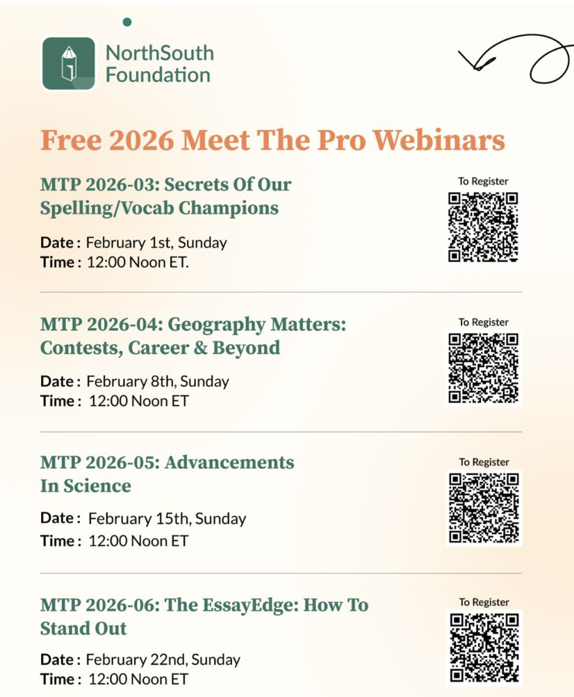 Avani competed in the Scripps National Spelling Bee twice in 2019, as well as in 2021 tying for 7th place. She feels that North South played a pivotal role in developing her foundation as a speller, giving me a platform to practice before the Scripps National Spelling Bee. Currently, she is running a spelling bee club to help provide other students in my locale an opportunity to hone their skills to achieve their dreams in spelling; all my proceeds go to local charities. Avani will talk about “Anglicization” of Hindi/Sanskrit words.